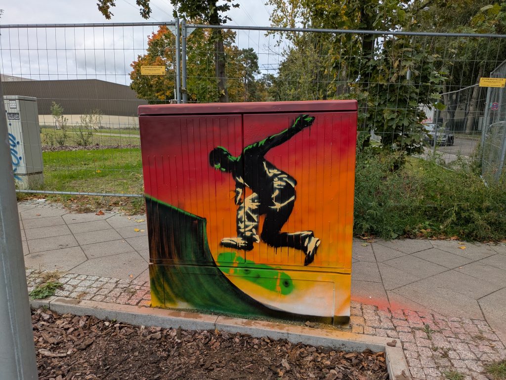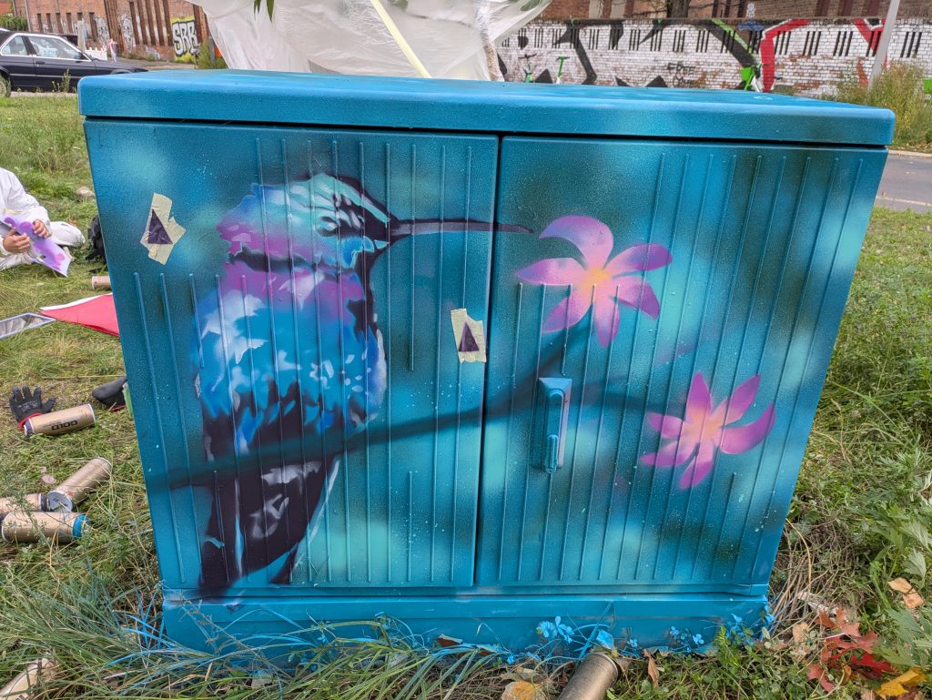 Möglich wurde diese Aktion durch eine wunderbare Kooperation: Der Verein Meredo e.V. hat den Workshop professionell angeleitet und durchgeführt. Mit viel Geduld und tollen Ideen zeigten sie den Kindern, wie man mit Hilfe von Schablonen und Sprühfarben beeindruckende Motive gestaltet. Das gesamte Projekt wurde von der Stromnetz Berlin GmbH organisiert und finanziert, die es sich zur Aufgabe gemacht hat, den öffentlichen Raum gemeinsam mit Anwohner*innen zu verschönern.