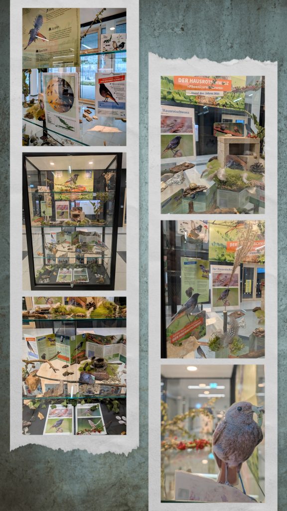 Vitrine im Foyer zum Hausrotschwanz. Gestaltet unter Mitwirkung von Schülerinnen und Schülern des Wahlpflichtunterrichts Natur und Nachhaltigkeit.